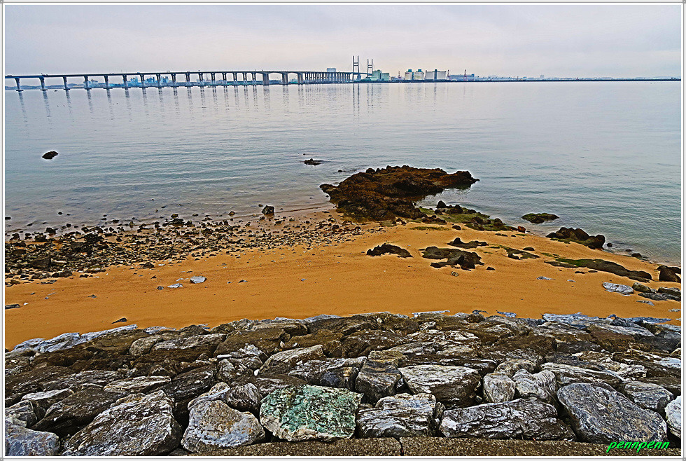 매산해안공원을 뒤로하고 방조제를 따라 남하하는데, 북동쪽으로는 서해대교의 주탑이 우뚝하군요. 잠시 후 간이선착장을 지나며 바라본 해안가에는 여름철 해수욕을 해도 될 만큼 멋진 모래해변이 펼쳐집니다. 길을 가면서 우측 언덕에 보이는 서해랑길 83코스 글씨가 궁금해 올라가보니 수영장 같은 시설물도 있네요.