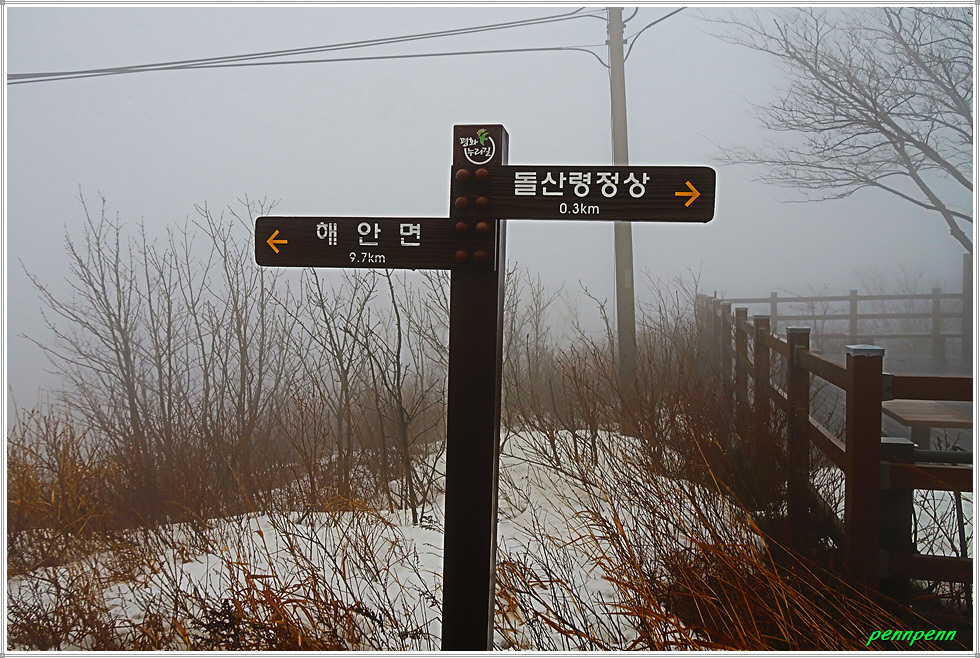 오늘 12.5km를 걷는데 3시간 40분이 소요되었습니다. 그런데 걷기를 시작할 때부터 마칠 때까지 짙은 안개로 인해 아무런 조망도 하지 못했고 가장 하이라이트인 펀치볼의 모습을 볼 수 없었음은 유감입니다. 또한 돌산령을 하산하는 코스의 차도는 제설작업이 전혀 안되어 미끄러운 길을 걷느라 크게 고생했습니다.
