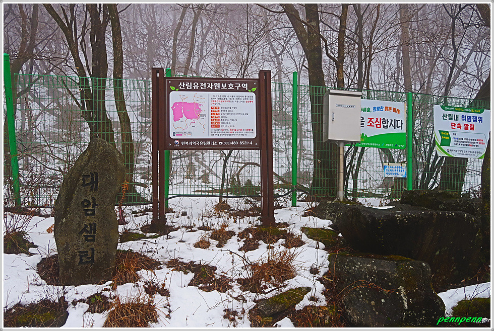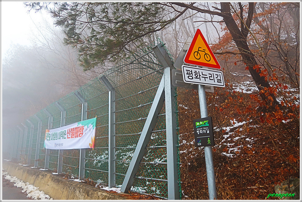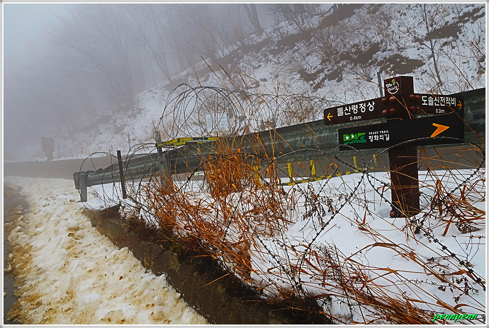 필자는 2년 전 강원도 평화누리길을 걸으며 이 코스를 답사하였기에 이번에는 복습하는 셈입니다. 평화누리길의 이정표는 낯이 익군요. 도로변 쉼터에서 일행을 만나 간식을 먹습니다. 안개가 얼마나 짙은지 30m만 떨어져도 전혀 앞사람이 보이지 않을 지경입니다. 차도는 제설작업이 되어 있어 걷기 편하지만 도로를 벗어난 지역은 그간 내린 눈이 쌓여 설국으로 변해 있습니다.