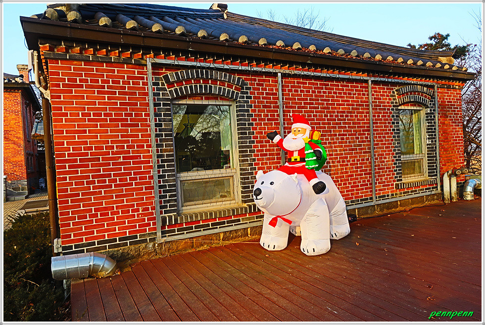 본당 좌측에는 예수상이 있고 안쪽에는 공세리 박물관이 있네요. 박물관도 개방을 하지 않아 내부를 둘러보지는 못했습니다. 박물관 옆에는 베네딕토관이 있는데 북극곰을 타고 있는 산타의 모습이 앙증맞습니다. 여기에도 수령 420여 년이 지난 보호수 느티나무 한그루가 웅장한 자태를 뽐내고 있습니다.