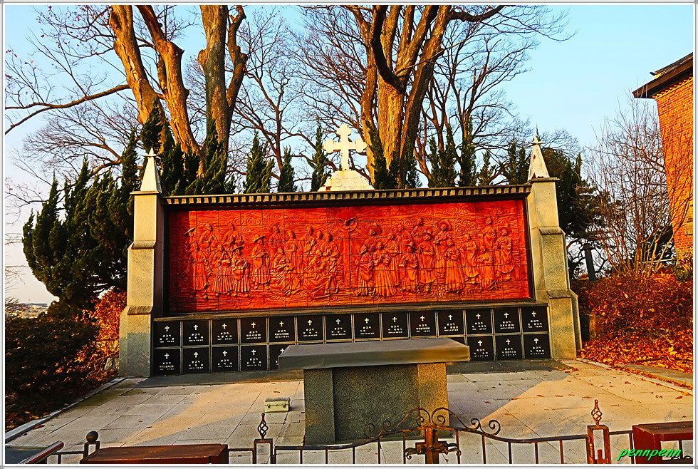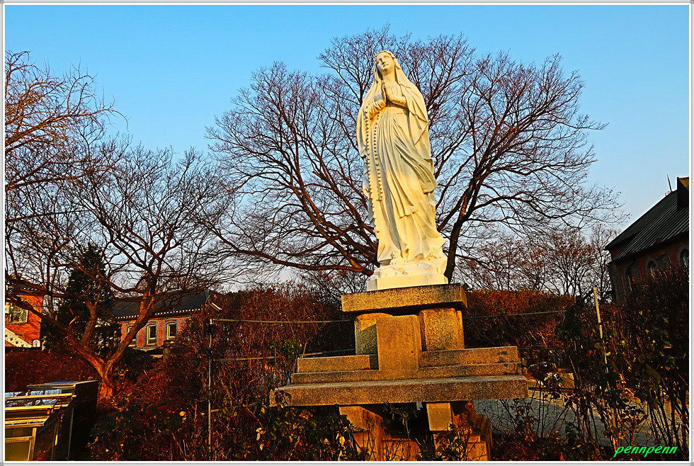 본당 뒤로는 십자가의 길이 조성되어 있는데 시간에 쫓겨 첫 번째 조형물만 사진에 담았습니다. 본당 아래쪽 사잇길로 내려가면서 기도하는 곳인 성체조배실을 지나갑니다. 그 아래 공간에는 순교성인의 동상이 보이는데 현지에 안내문이 없어 내용을 잘 모르겠습니다. 이곳의 성벽은 조선전기 건축된 조세미 관련 창고터로 이곳 공세리는 조선시대에 아산, 서산, 한산을 비롯하여 청주, 옥천 등 39개 고을의 조세를 조운선을 이용하여 서울의 경창으로 보내던 공세곶고지가 있던 곳입니다. 현재 창고지(倉庫址) 주변에 축조한 성벽이 약 680m 정도 남아 있습니다. 지금까지 성당의 이모저모를 개략적으로 살펴보았는데 야경은 어떨지 무척 궁금해집니다.