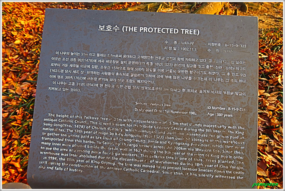 이제 성당(본당) 앞으로 갑니다. 마당에는 수령 390여 년의 보호수 팽나무 한그루가 서 있군요. 뜰에는 예수님과 제자들의 모습을 재현해 놓고 있습니다. 본당은 참으로 반듯한 건축물로 100년의 역사를 꿋꿋하게 버텨 왔습니다. 내부를 보고 싶었지만 사진촬영금지로 인해 아쉬운 발길을 돌려야했습니다.