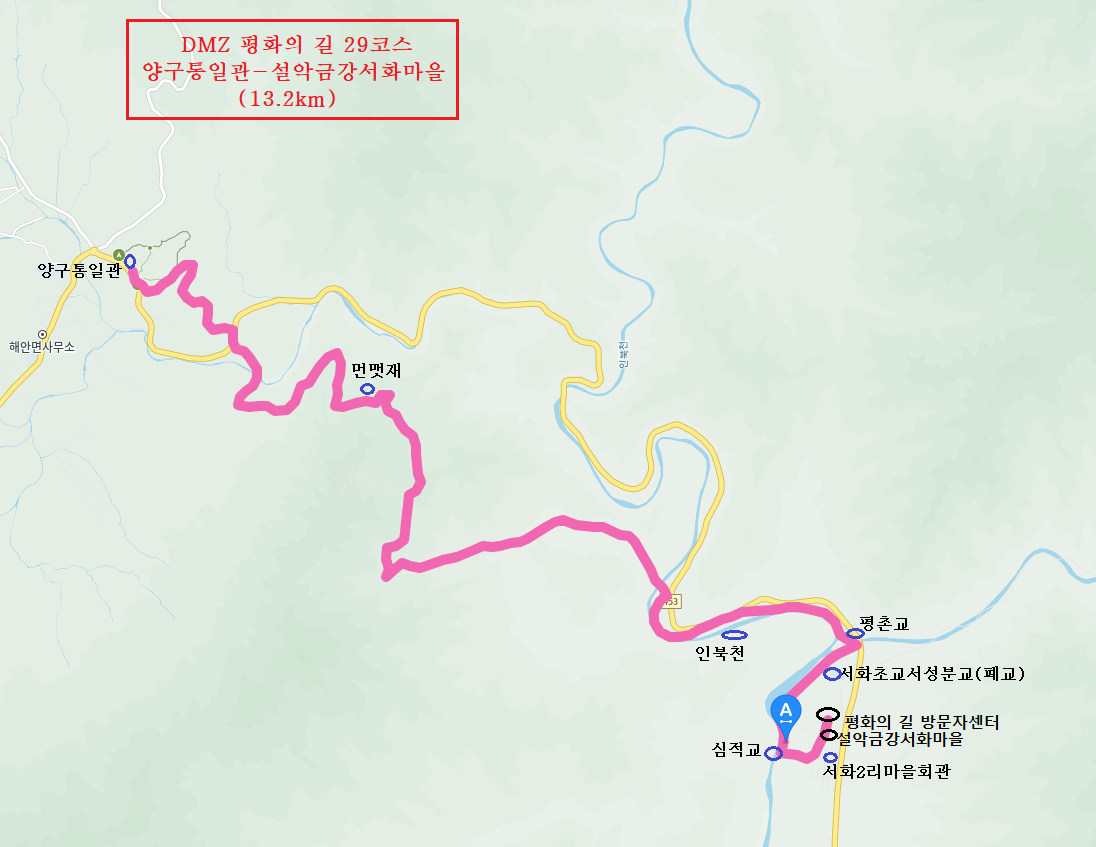 ▲ 코스 : 양구통일관-임도-양구.인제 경계-먼맷재-인북천-평촌교-심적교-평화의길 방문자센터(설악금강서화마을)