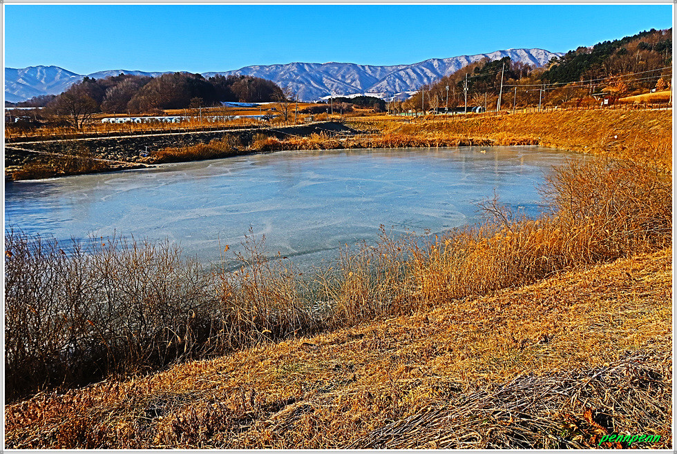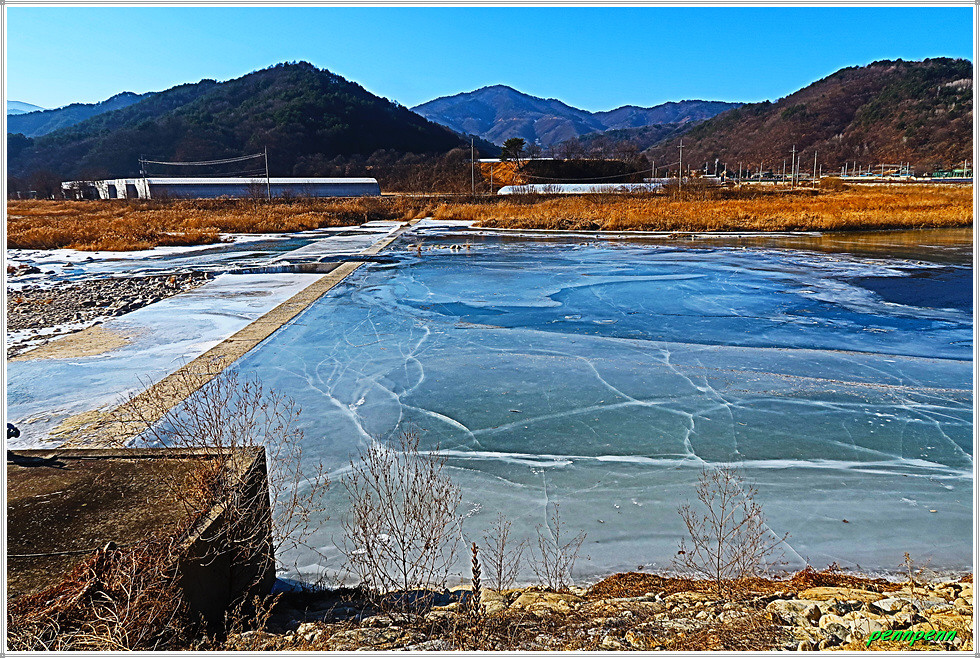 인북천변에는 데크길을 잘 조성해 놓았군요. 응달의 강은 꽁꽁 얼어붙었습니다. 강은 반원을 그리며 돌아가 우리도 강을 따라 걷습니다. 반월촌교 옆을 지나 S자 형식으로 돌아가니 강둑 안쪽에 태양광발전패널이 설치되어 있군요. 강변을 따라 가던 길은 잠시 후 453번 지방도로(금강로)를 다시 만나 서화천에 걸린 평촌교를 건넙니다. 이곳은 서화천이 인북천에 합류하는 곳이네요.