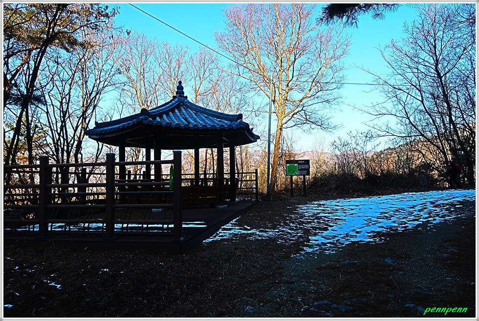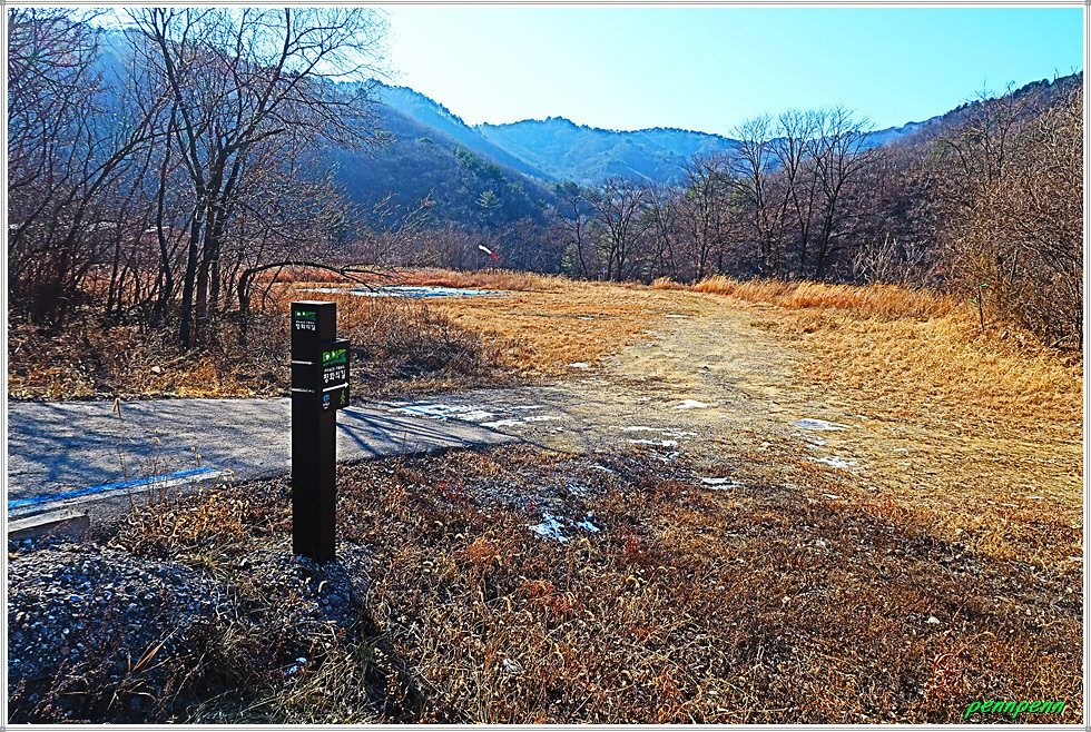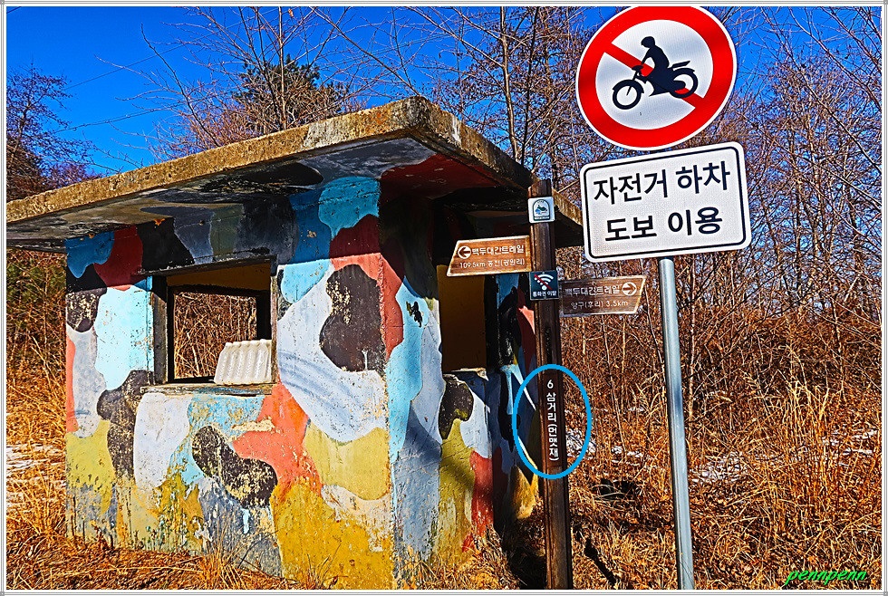 물골교를 건너 직진하면 임도로 이어집니다. 이제부터는 조망도 전혀 없고 눈이 쌓여 있어 발걸음이 조심스러운 정말 지루한 길을 걸어야 합니다. 지뢰위험지역을 알리는 경고문에 오싹합니다. 차량통행금지 차단시설을 지나 완만하게 진행되는 오르막을 갑니다. 첫 번째 정자에는 2년 전 걸었던 평화누리길(자전거길) 안내문이 붙어 있군요.