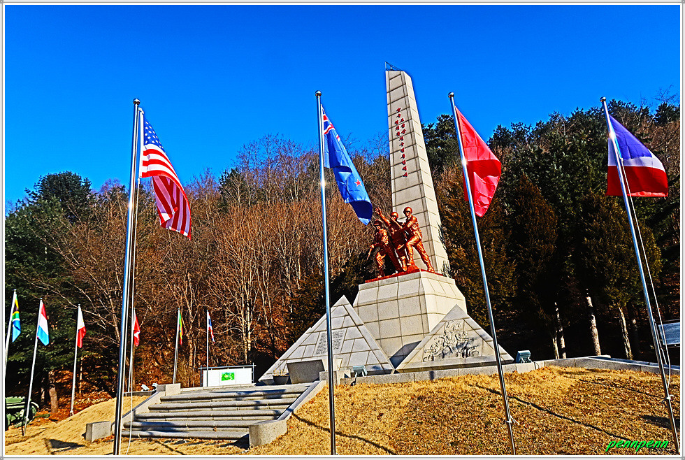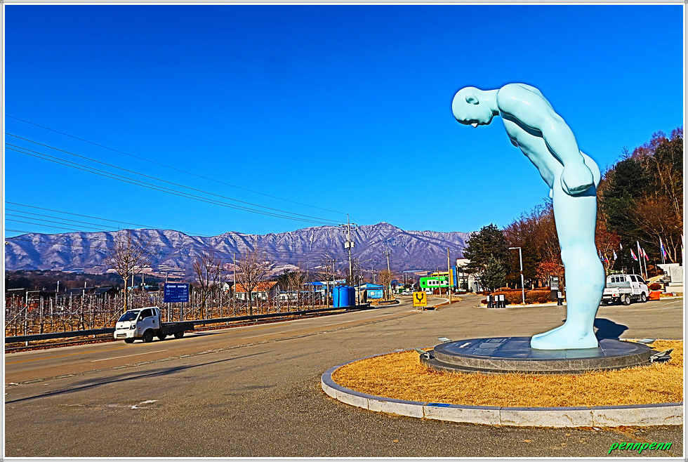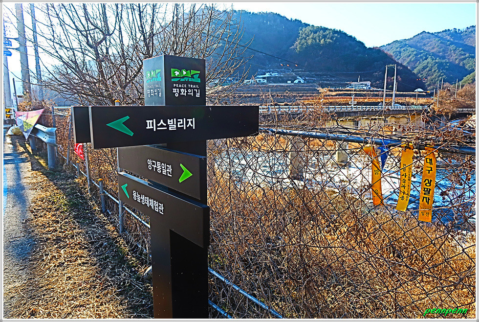 양구전쟁기념관 우측에는 DMZ 조이너스 체험장이 있는데 평화의 길은 이 체험장 옆 산길로 가야하지만 쌀쌀한 날씨에 체력을 아끼기 위해 산길 대신 그냥 453번 지방도로(해안서화로)를 따라 갑니다. 서쪽을 바라보면 눈이 내린 하얀 산의 능선에 을지전망대(1,049m)가 우뚝합니다. 이 전망대는 군사분계선(MDL)에서 남쪽으로 약 1km 떨어진 곳에 자리하고 있으며, 금강산 비로봉 등 북쪽 산악 풍경을 조망할 수 있는 안보 관광지로 알려진 곳인데 필자는 아직 답사하지 못했습니다. 길을 가면서 뒤돌아보니 을지전망대 이정표가 있군요.